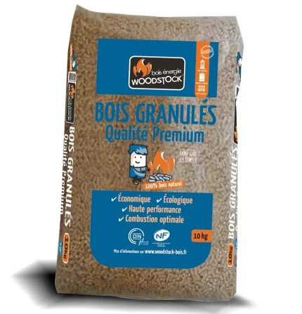02 PALETTES WOODSTOCK GRANULÉS DE BOIS – 144 SACS DE 15 KG Idéal pour Poêle à Granulés, Insert à Granulés et Chaudière à Granulés Production de chaleur optimum : Très faible taux d’humidité et de poussière pour un rendement inégalé. Combustion « propre » : sans dommage pour la planète : peu de cendre Granulométrie constante & régulière : Facilite l’écoulement automatique dans l’appareil Certifié : DINplus – NF Matières premières contrôlées & maîtrisées : Éco-produit conçu à partir de la valori­sation des connexes de scieries, tous issus de bois de forêts durablement gérées. Qualité Premium : Issue des recherches en laboratoire et supérieure aux exigences des normes qualitatives en vigueur. Caractéristiques : Certification DINplus – NF Composition 100 % Résineux PCI sur brut(1) 4,8 kWh.kg-1 ≤ PCI ≤ 5,3 kWh.kg-1 Masse volumique apparente ≥ 650 Kg/m-3 Taux de fines < 0,5 % Taux de cendres à 550°C ≤ 0,5 % Humidité ≤ 8 % Durabilité ≥ 97,5 % Longueur 3,15 mm < Longueur < 40 mm Diamètre 6 mm ±1 Qualité Premium Application Tout type d’appareil à granulés Contrôle laboratoire CERIC